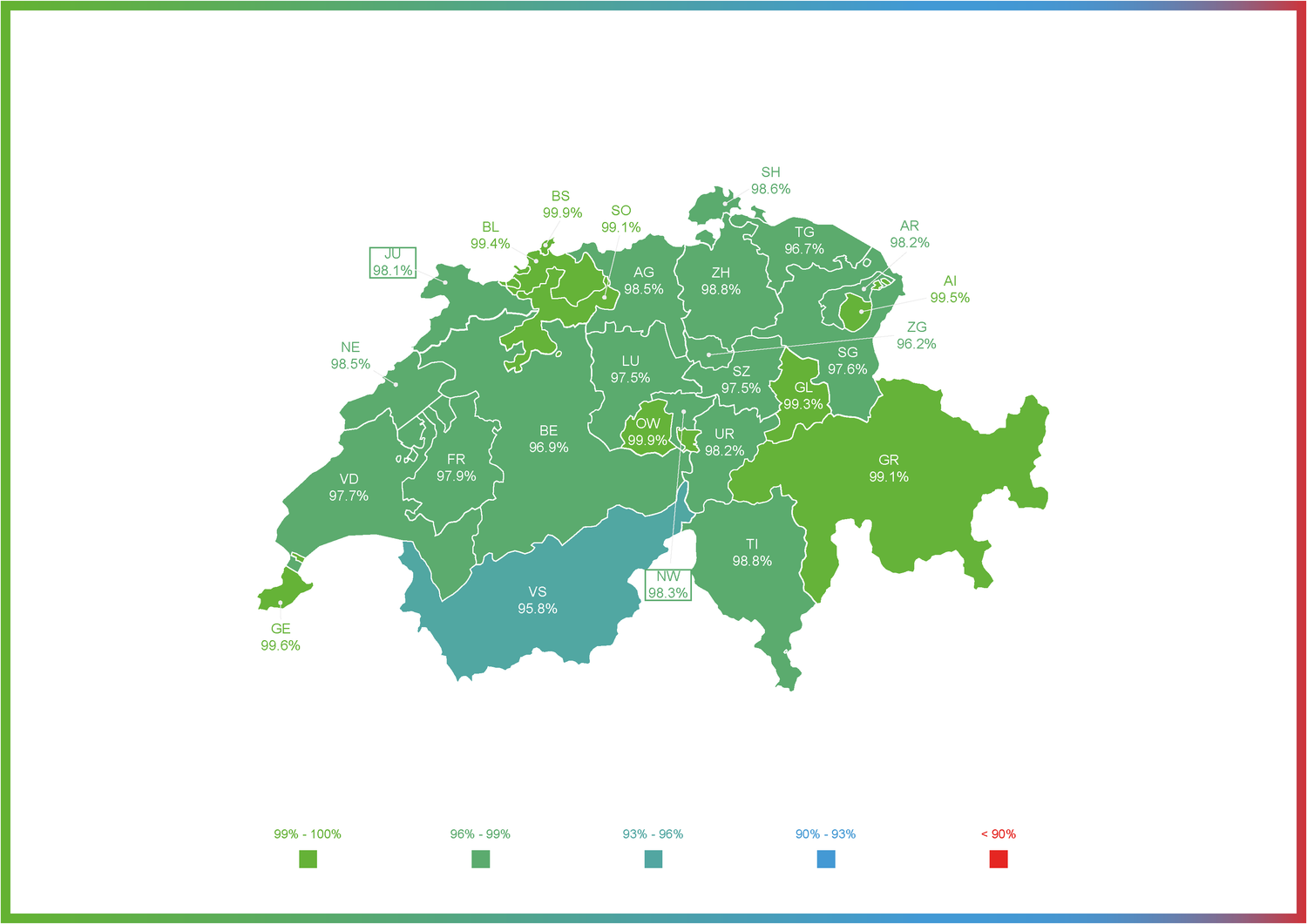 Das dritte Jahr in Folge wies der Kanton Wallis beim Zugang zu den Zahlungsverkehrsdiensten der Post den landesweit niedrigsten Wert auf, nämlich 95,8 Prozent (gleich wie 2023). Obwohl der Kanton Wallis den Schwellenwert von 90 Prozent deutlich übertrifft, ist er der einzige Kanton, dessen Wert unter 96 Prozent liegt. Am deutlichsten verbesserte die Post im Jahr 2024 den Zugang zu den Zahlungsverkehrsdiensten in den Kantonen Glarus und Luzern – hier lag der Zuwachs jeweils bei +0,8 Prozentpunkten. Die Bevölkerung in den Kantonen Basel-Stadt und Obwalden geniesst den besten Zugang zu den Zahlungsverkehrsdiensten der Post: Im Jahr 2024 erreichten Basel-Stadt und Obwalden 99,9 Prozent (2023: Basel-Stadt 100 %, Obwalden 99,9 %).