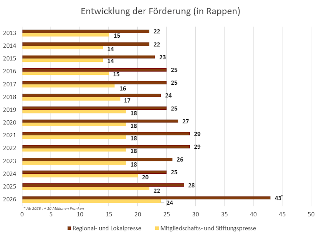 Um die Presse- und Meinungsvielfalt zu erhalten, leistet der Bund jährlich einen Subventionsbeitrag von 50 Millionen Franken für die ermässigte Zustellung von Zeitungen und Zeitschriften. Davon profitieren die Regional- und Lokalpresse mit 30 Millionen Franken und die Mitgliedschafts- und Stiftungspresse mit 20 Millionen Franken.