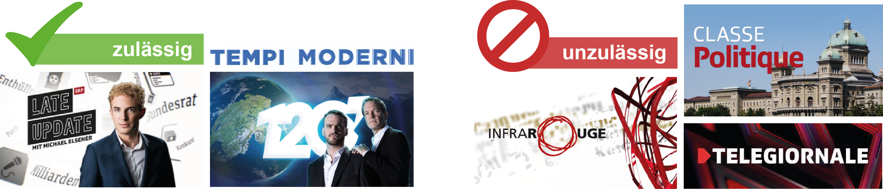 - Die optische Ausgestaltung (Schriftbild und Farbgebung) des Sendungstitels muss sich massgeblich von der optischen Ausgestaltung des Auftritts des Sponsors beziehungsweise seines Produkts unterscheiden (z.B. darf für den Schriftzug nicht das Logo des Sponsors verwendet werden).