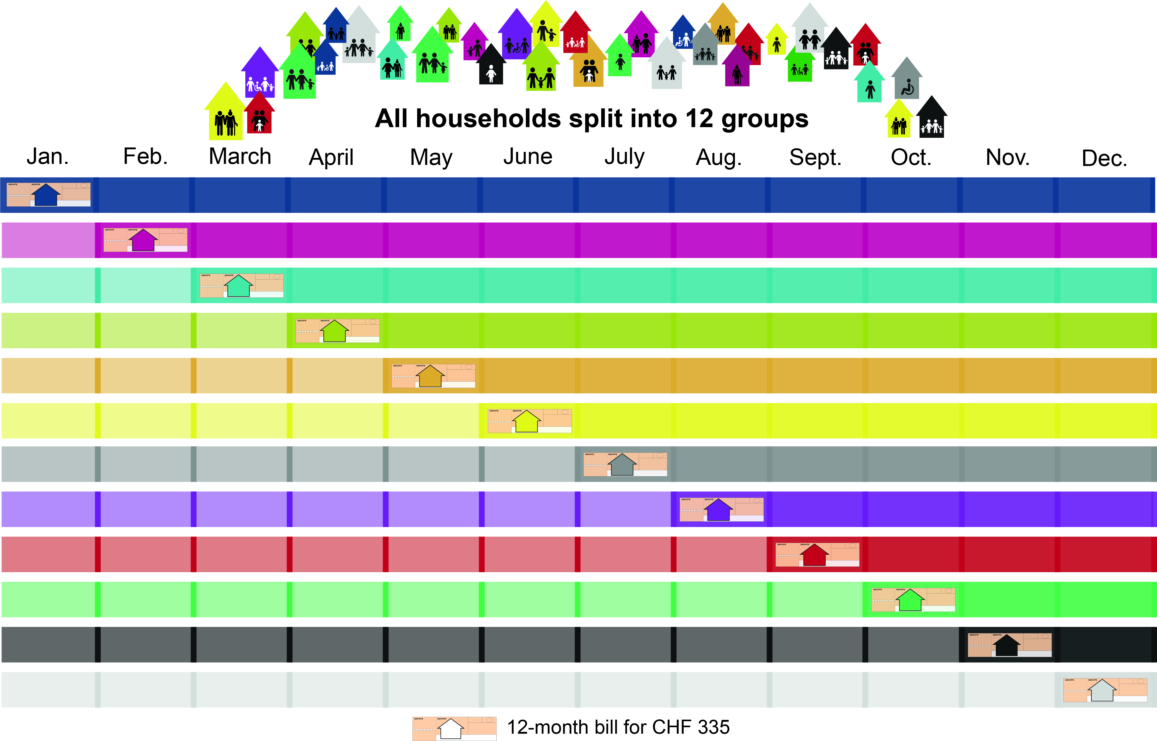 - Every private household was randomly allocated to one of 12 billing groups. If the private household is in the first group, it receives an annual invoice for CHF 335 in January. If it belongs to the second group, it receives the annual bill in February, and so on through the year.