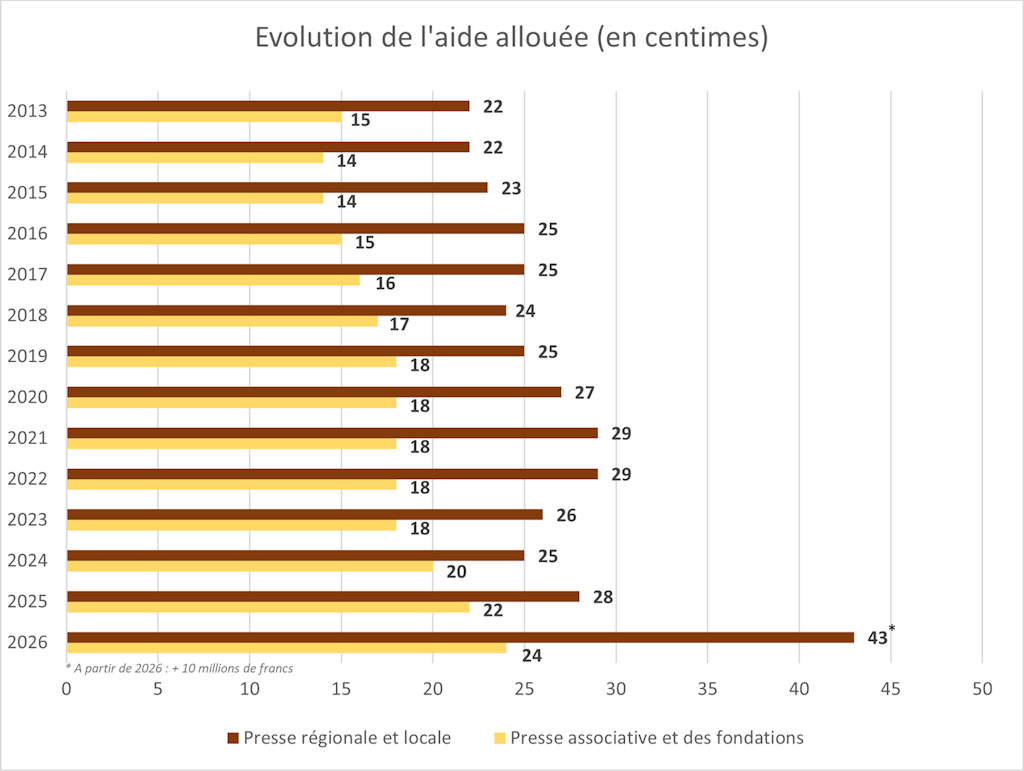 Afin d'assurer la diversité de la presse et des opinions, la Confédération accorde une subvention annuelle de 50 millions de francs pour le transport de journaux par la poste à un prix réduit. 30 millions sont attribués à la presse régionale et locale, 20 millions à la presse associative et des fondations.