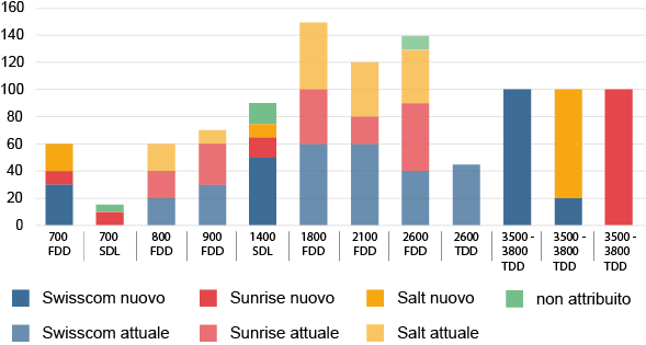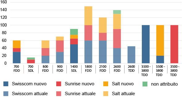 Grafico: Dotazione di frequenze complessiva degli operatori di telefonia mobile in Svizzera dopo l'asta*