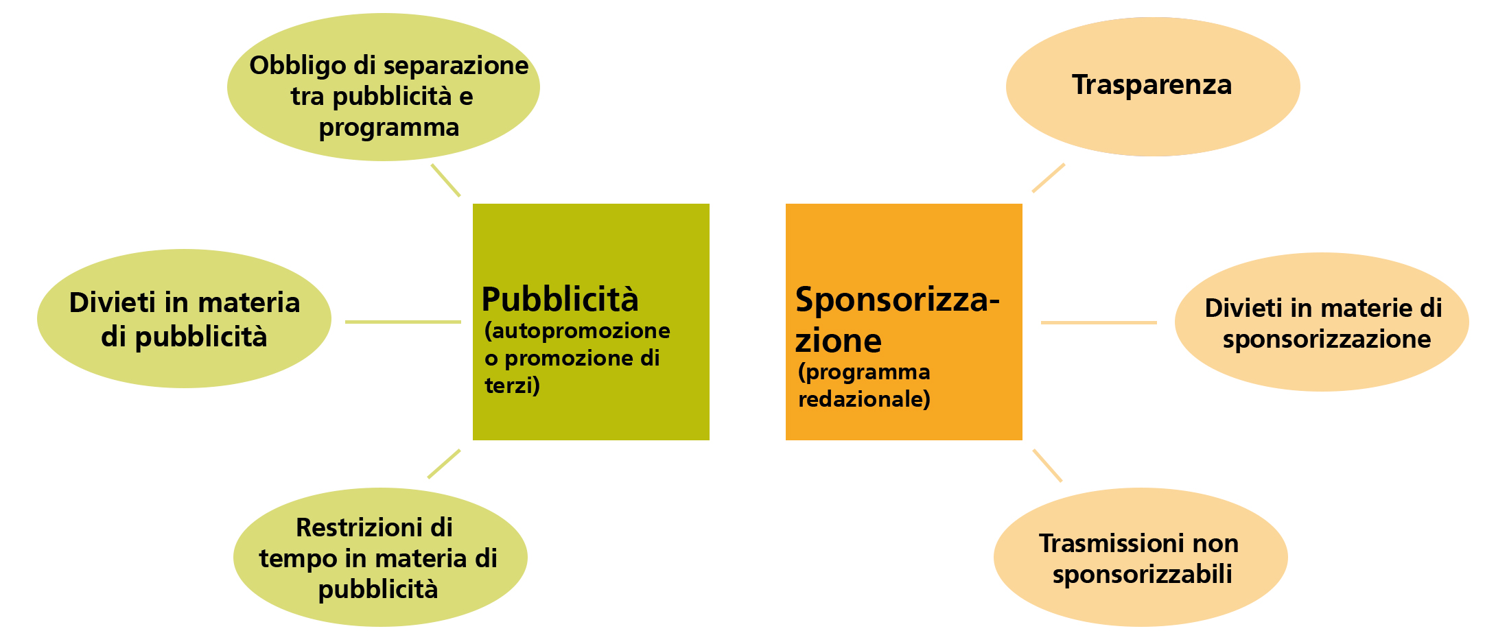 Entrambe le forme di finanziamento sono soggette a regole proprie, che tengono conto delle particolari costellazioni e vogliono contrastare i diversi rischi per la creazione di un programma indipendente. Le principali disposizioni in materia pubblicitaria riguardano i divieti di pubblicità, la presenza della dicitura "pubblicità" nonché la durata ammissibile della pubblicità. Nel caso della sponsorizzazione occorre soprattutto impedire l'ingerenza indesiderata dello sponsor sul contenuto delle trasmissioni sponsorizzate e garantire al pubblico la trasparenza circa il finanziamento di una trasmissione da parte di terzi. Si tratta, in ultima analisi, di non mescolare il programma redazionale con i messaggi pubblicitari (obbligo di separazione).