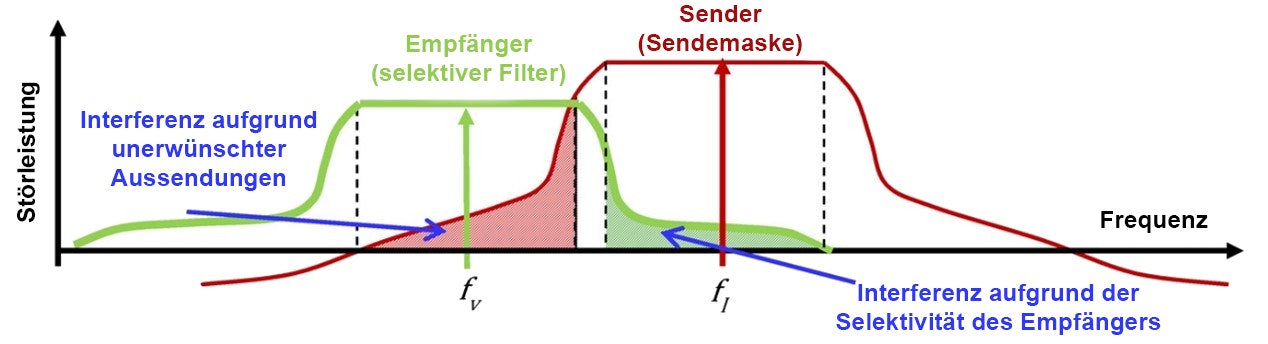 Sia i trasmettitori che i ricevitori svolgono un ruolo importante nell'utilizzo efficiente dello spettro delle frequenze e quindi nel ridurre le interferenze. I trasmettitori devono quindi essere concepiti in modo da non interferire con gli utenti dello spettro che sono vicini (zona rossa in basso). D'altra parte, i ricevitori devono essere sufficientemente selettivi per respingere i segnali di interferenza provenienti dai trasmettitori vicini (zona verde in basso).