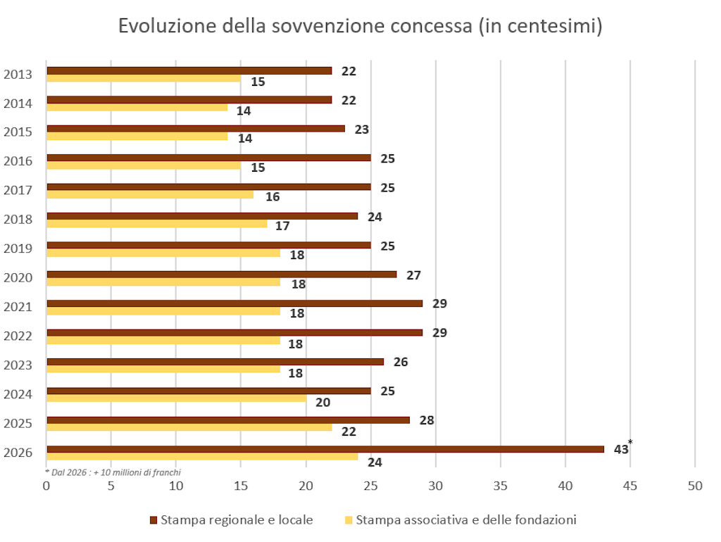 Per mantenere la pluralità di stampa e di opinione, la Confederazione offre delle sovvenzioni annue di 50 mio. di franchi per la distribuzione a prezzo ridotto di giornali e periodici. 30 mio. di franchi sono in favore della stampa regionale e locale e 20 mio. in favore della stampa associativa e delle fondazioni.