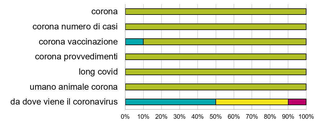 I motori di ricerca svolgono un ruolo importante quando le persone si trovano di fronte a eventi e sviluppi nuovi e inaspettati. La pandemia di coronavirus ne è un buon esempio. Uno studio sostenuto dall'UFCOM ha analizzato quali fonti e contenuti vengono messi in risalto dall'algoritmo di Google (studio 1). Dall’analisi è emerso che le parole chiave utilizzate giocano un ruolo decisivo nel determinare se nei risultati della ricerca appaiono fonti piuttosto informative o se a prevalere sono invece maggiormente contenuti nei quali la disinformazione è incontestata o addirittura attivamente diffusa.