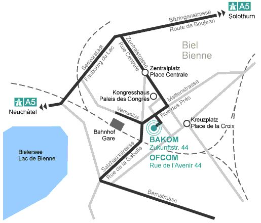 Bandunai la staziun direcziun citad. Ordaifer la staziun vulvais Vus a dretga e giais per lung da la Johann-Verresius-Strasse fin a la rundella. Traversai la rundella e giai per lung da la Mattenstrasse fin a l'emprima cruschada. A la cruschada giai a dretga en la Zukunftstrasse. En il segund edifizi da la vart dretga è il UFCOM.